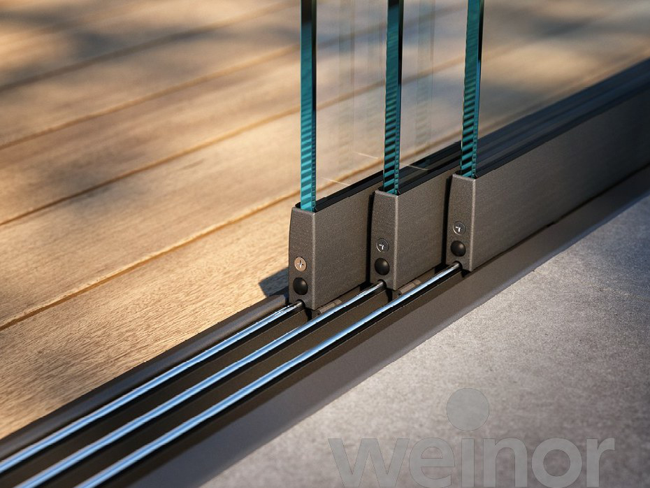 Neben der höheren Standard-Bodenschiene mit weinor CleanCase® kann auch eine flache Variante gewählt werden, perfekt für Barrierefreiheit. Sie ist so niedrig, dass sie nahezu kein Hindernis beim Übergang darstellt. Für einen schönen Übergang zwischen Bodenschiene und Terrassenboden sorgen elegante Bodenanschluss-Profile, passend zu jedem Bodenbelag.