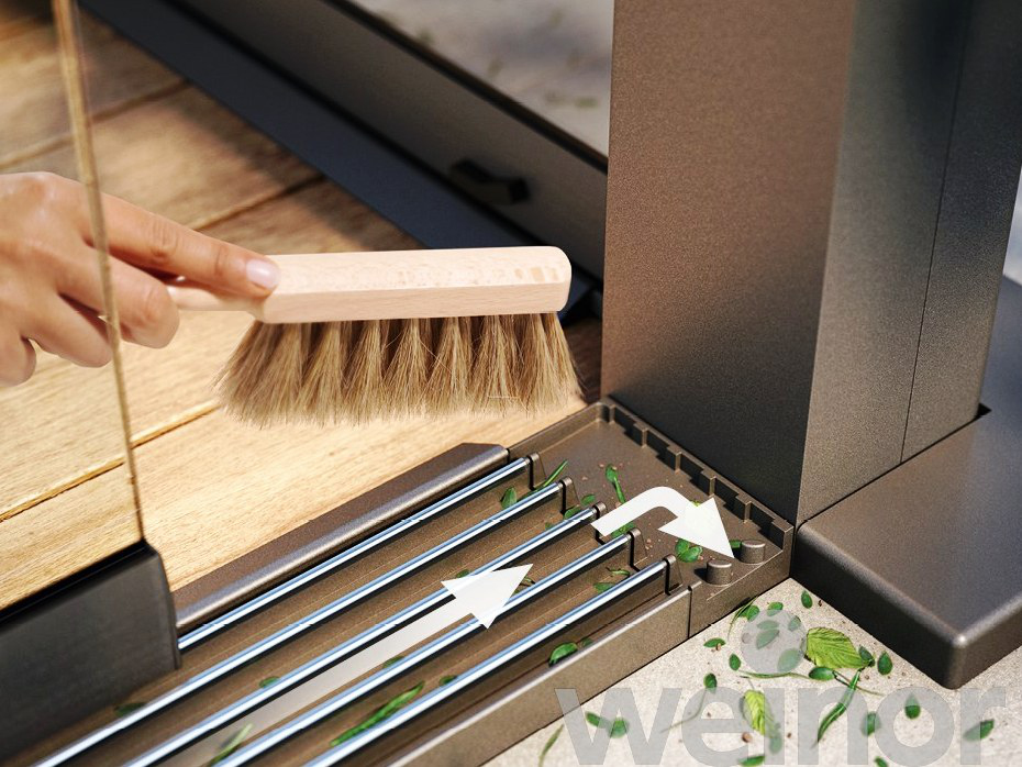 Die Bodenschiene dient zur Führung der Glaselemente. Hier kann sich schon einmal Laub und Schmutz von draußen sammeln. Mit einem Besen kann der Schmutz einfach in das CleanCase® und dann nach draußen gekehrt werden. Auch Regenwasser fließt kontrolliert über das CleanCase® ab.